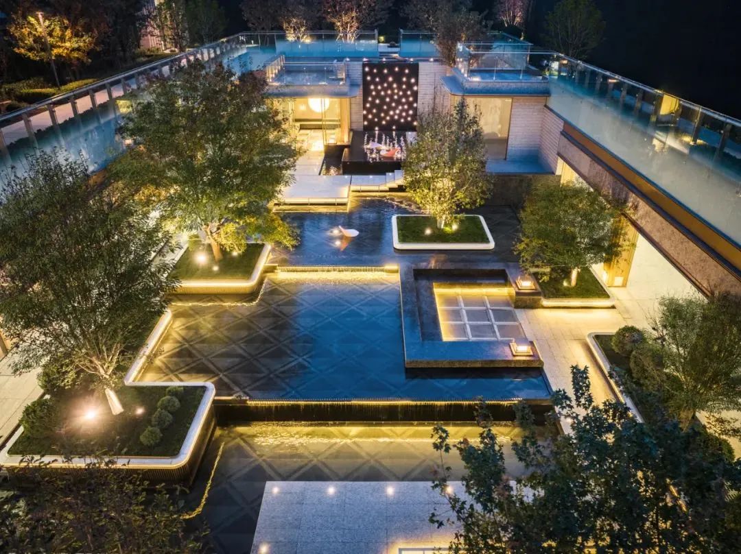 项目打破传统平面布局匠心构筑最高约8米台地立体园林。精心打造约600m下沉层叠水庭,引用斯卡帕艺术技法,整石铺就亚马逊绿奢石。