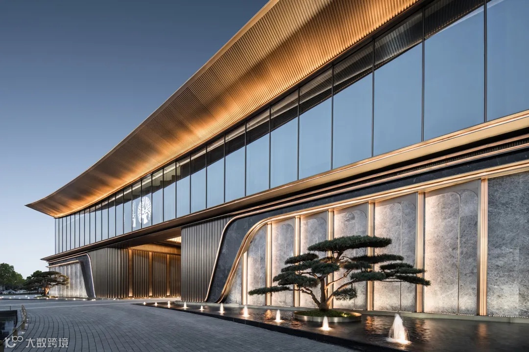 构成语言选取玉兰为母题,通过元素的提取、重构,将凝练的建筑语言融入主入口形象设计中,从柱式、雕塑、屏风纹样三个维度加以表达;结合铝板型材、金属线条、通透玻璃等现代材料,体现精致的细节,彰显尊贵气质。