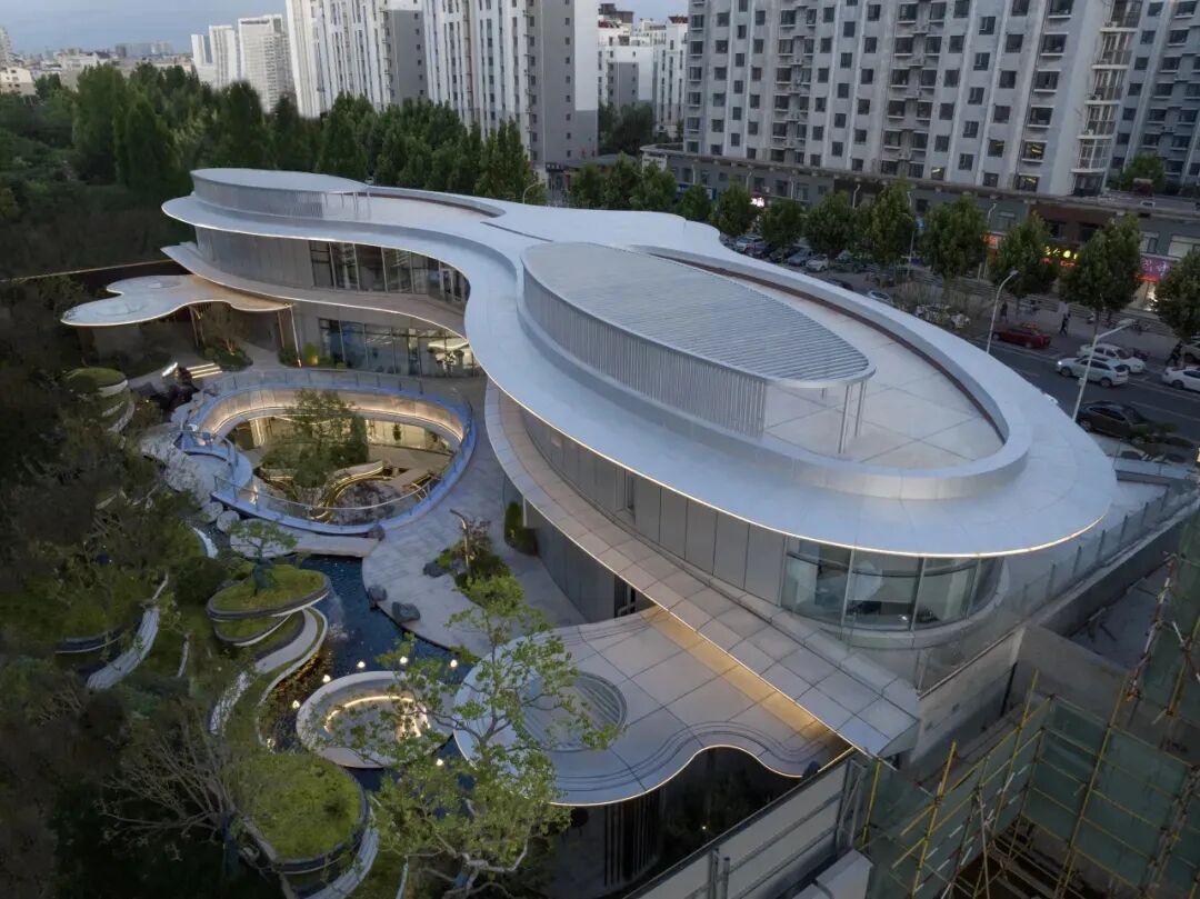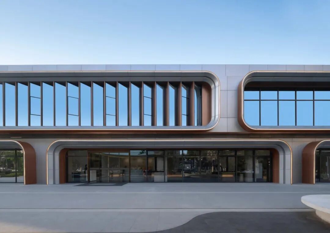示范区建筑外立面设计采用了全铝板和玻璃幕墙体系的组合,摒弃繁杂的外立面装饰设计,采用超流体风格,建筑师在设计过程中特别关注立面比例控制和曲线形体造型的精致呈现,每个细节都经过精心计算和布局,确保整体的协调和谐,使建筑外观更加流畅优雅,营造精致秩序感和简洁高雅气质。