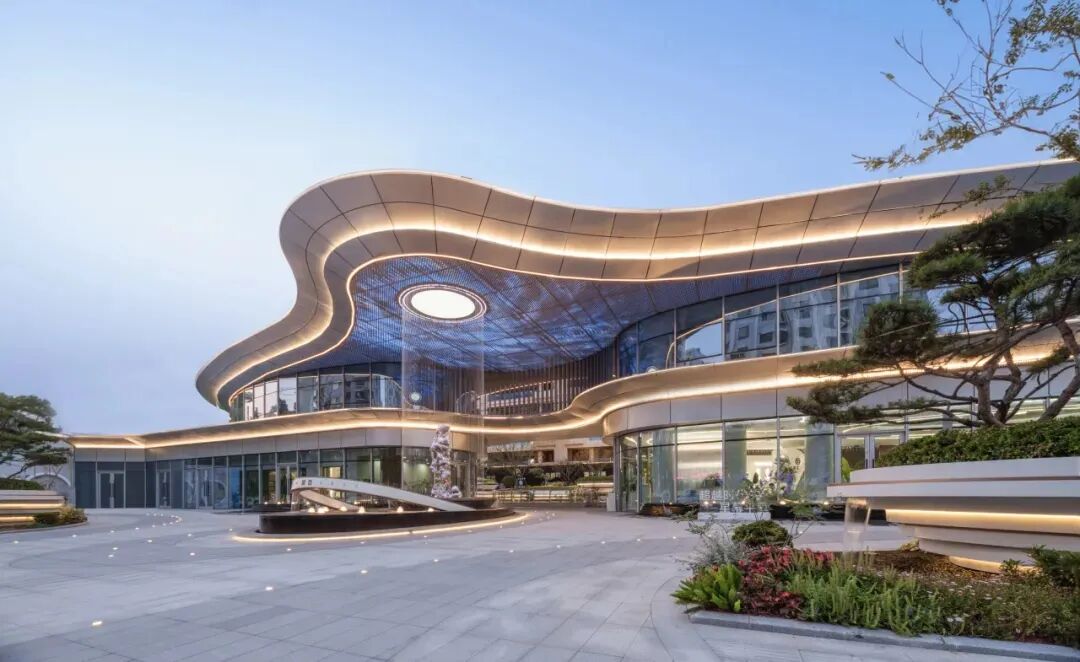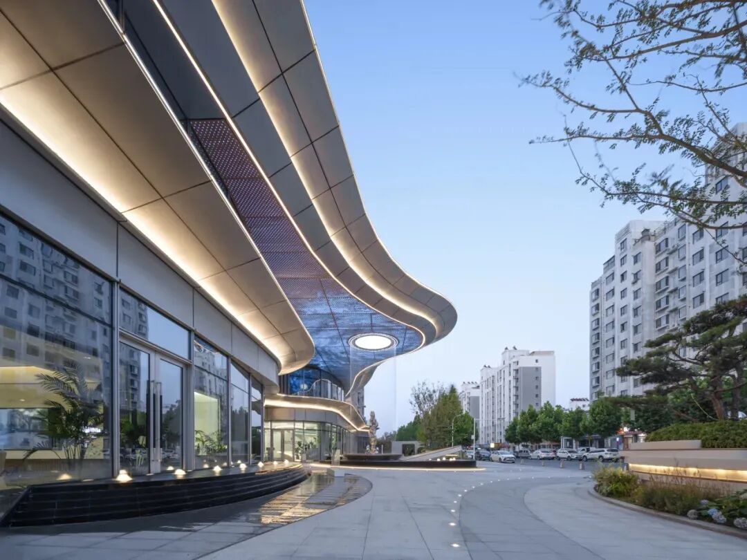建筑主入口的圆角呈现的是一种打开的姿态,将自然弯曲曲线融入立面,超9米外挑曲线造型,超大挑高,强化了酒店式礼遇感。