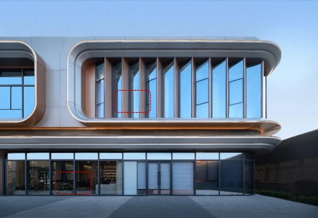 同时通过精准控制铝板与玻璃的分缝及交接构造节点,保证铝板与玻璃的自然转合交接,使建筑造型具有自由流淌的曲面感,彰显品质与美学的高度融合。