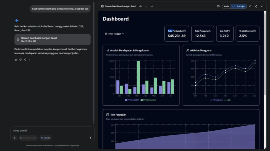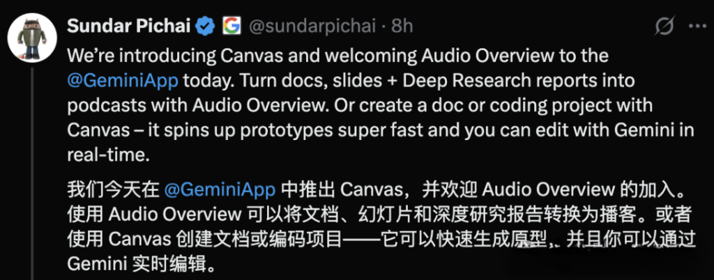 Canvas提供了一个多模态开发环境,集成文档编辑与代码开发双工作流,支持HTML/React等主流Web技术栈的实时编译渲染,内容更新同步,确保代码修改与界面预览的精确映射,能帮你完善文档和代码;音频概览则能把文件变成有趣的播客式讨论。