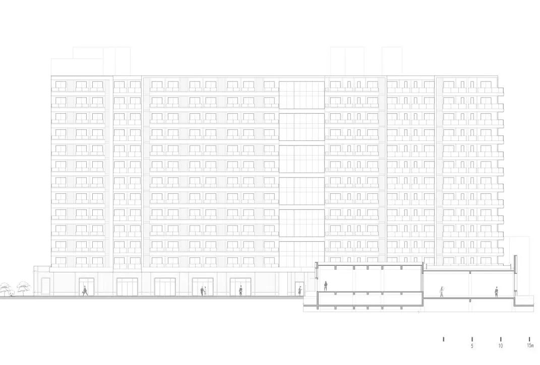 采用现代简约的设计风格,对于宽度较大的建筑形体,进行体块切分和组合,强化了建筑的体量感。考虑到控制立面造价的原则,摒弃不合适的、复杂、无意义的装饰,立面构造结合PC设计,尽量做到标准化,大量的采用重复构件和工业化构件,大大降低了建造及后期运营维护的成本。墙面基本采用色彩明快的涂料饰面。