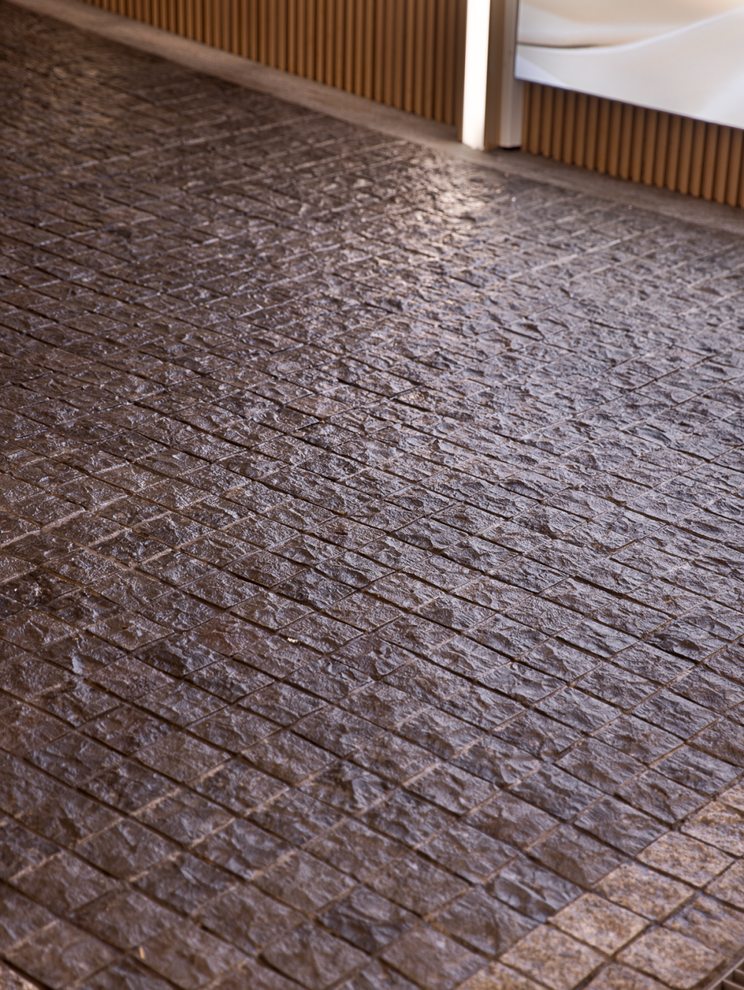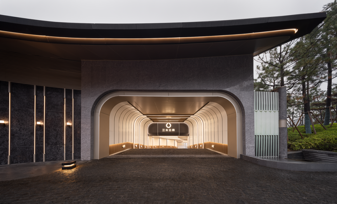 设计师以 “冰裂纹”为灵感,采用马蹄石通铺双坡道,其天然石材的肌理与防滑性能,既巧妙应对了绍兴的梅雨季节,又充分考虑了未来车辆的行驶体验。顶部铝板雕琢的迎宾动线,以金属的冷峻质感对抗潮湿侵蚀,在时光中沉淀出历久弥新的高级感。坡道两侧隐藏式线性灯带,消解地下空间的压抑感;车灯划过石材表面时,光影与肌理交织,归家之路如行于璀璨星河。