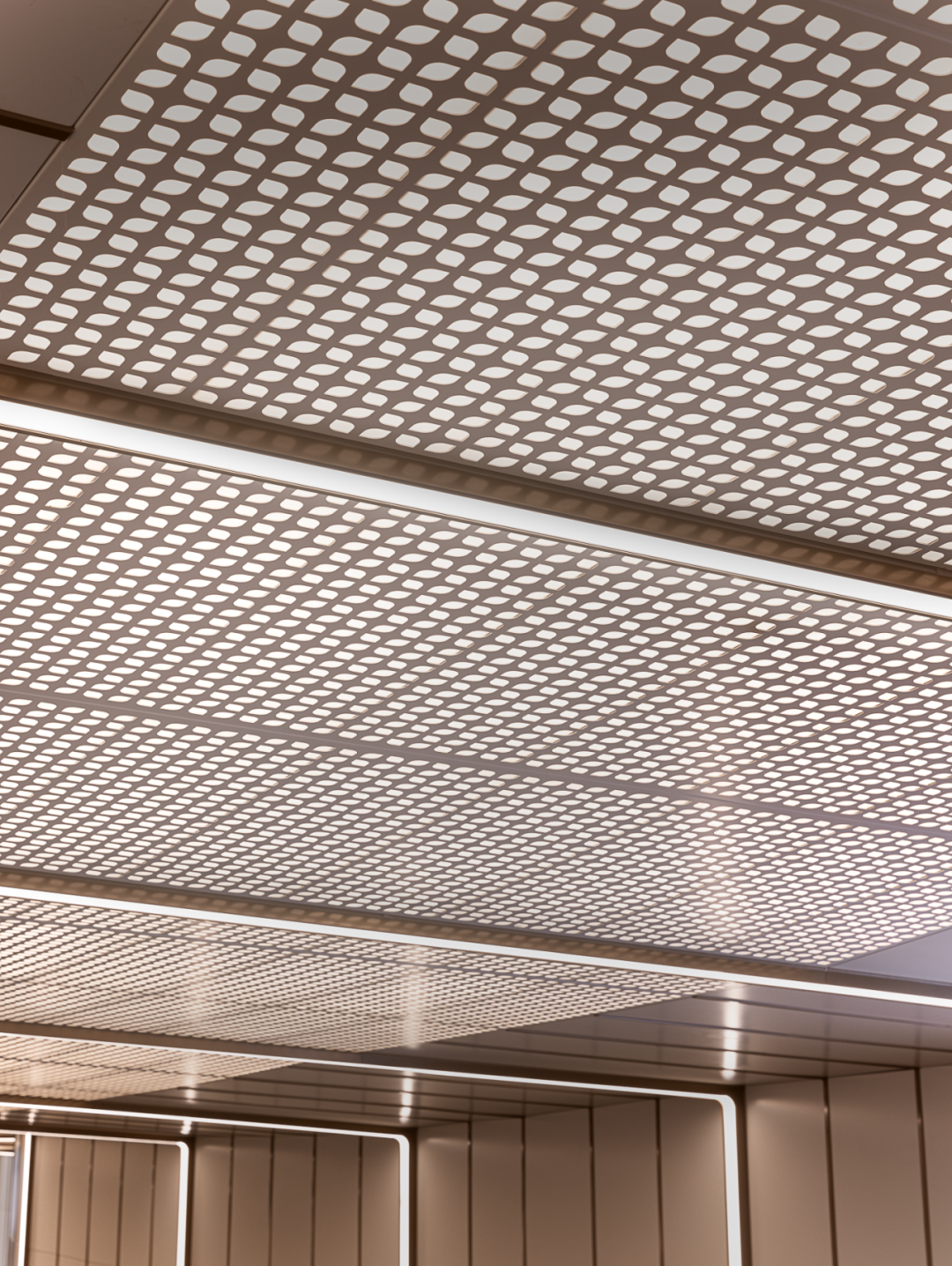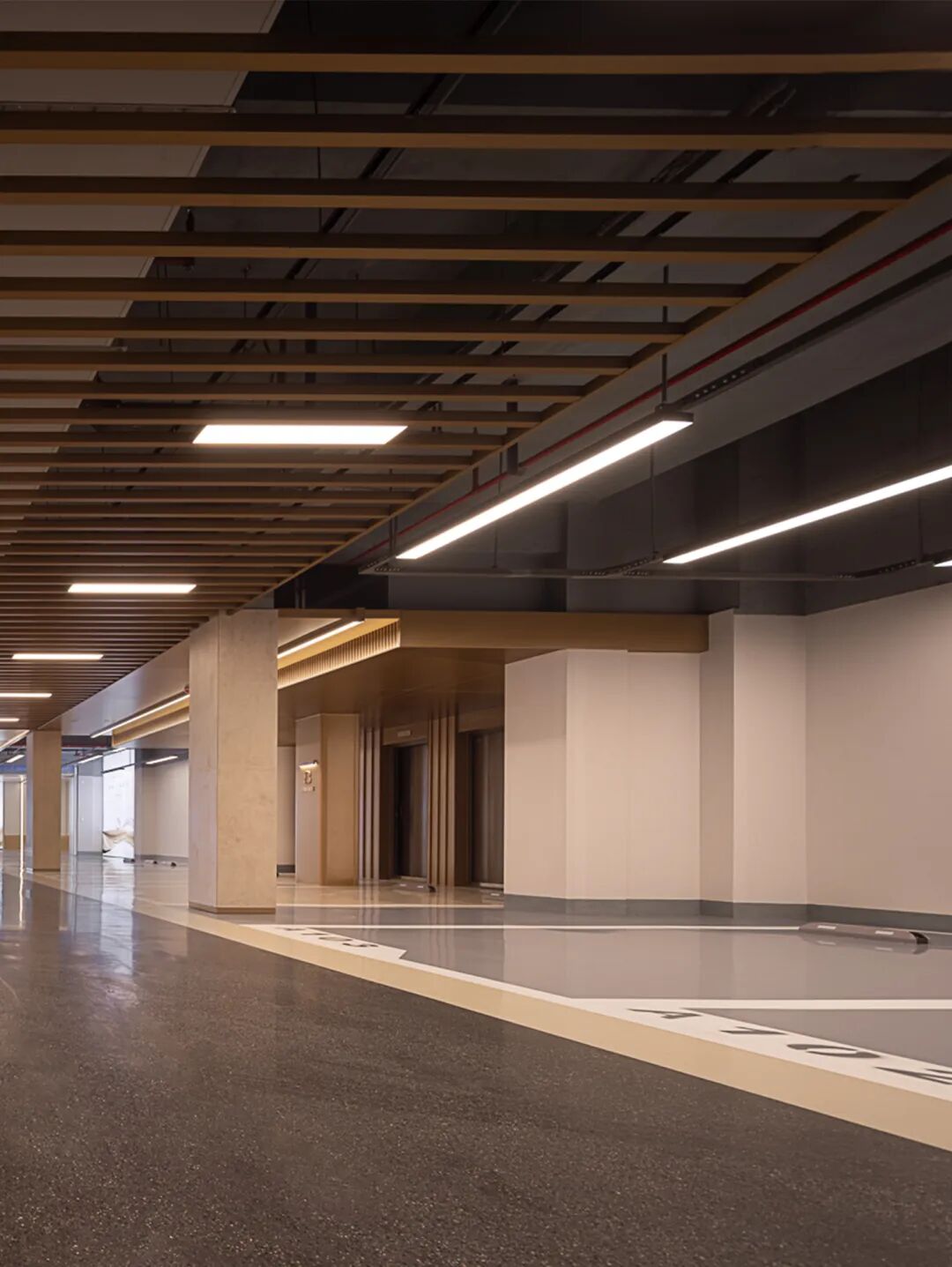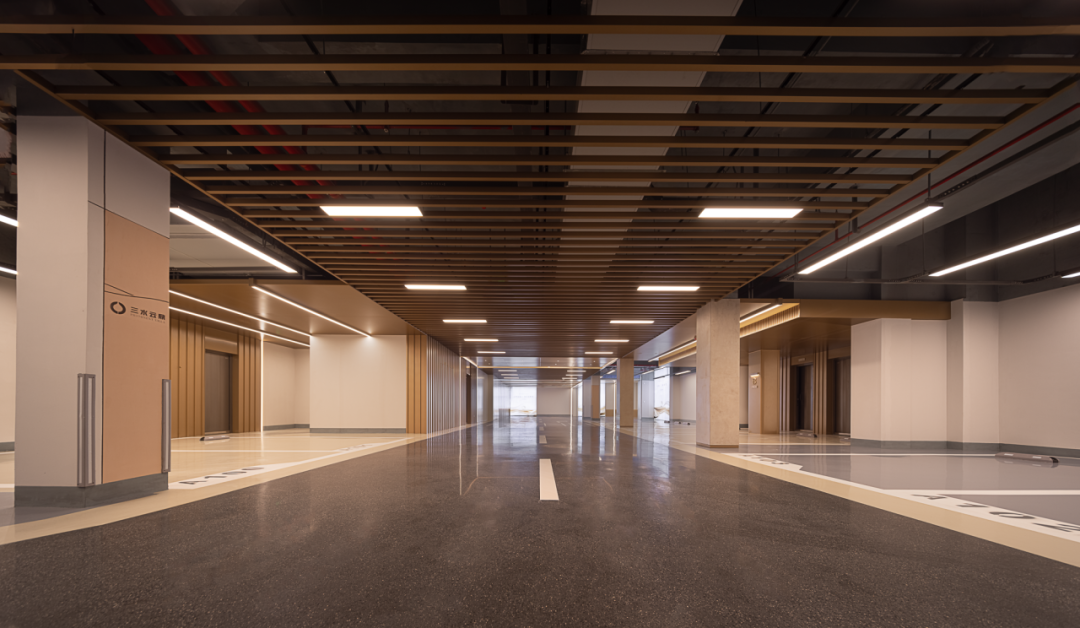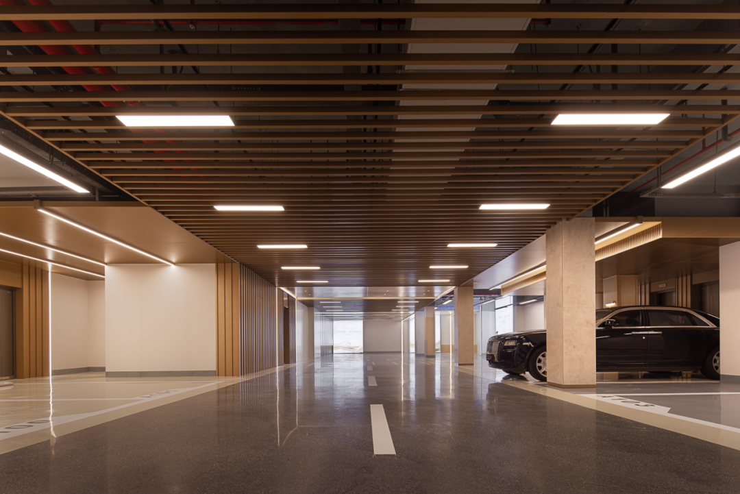 传统地库的管线裸露问题,在三水云鼎被转化为设计语言。设计师以“解构-重组”的手法,将消防、通风、照明管线纳入铝吊顶体系,通过模块化组合与灯光层次设计,让管线成为空间秩序的“隐性表达”。