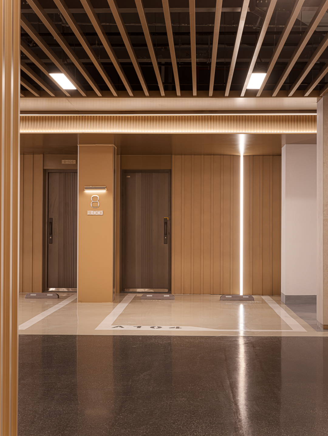 设计师以“酒店式落客区”为原型,打造业主专属的地下入户门厅,通过石材拼花、金属收口与灯光氛围的精密计算,将归家动线分解为“仪式前奏-核心体验-情绪收束”三重节奏,让归家动线成为一场“私人订制”的仪式盛宴。