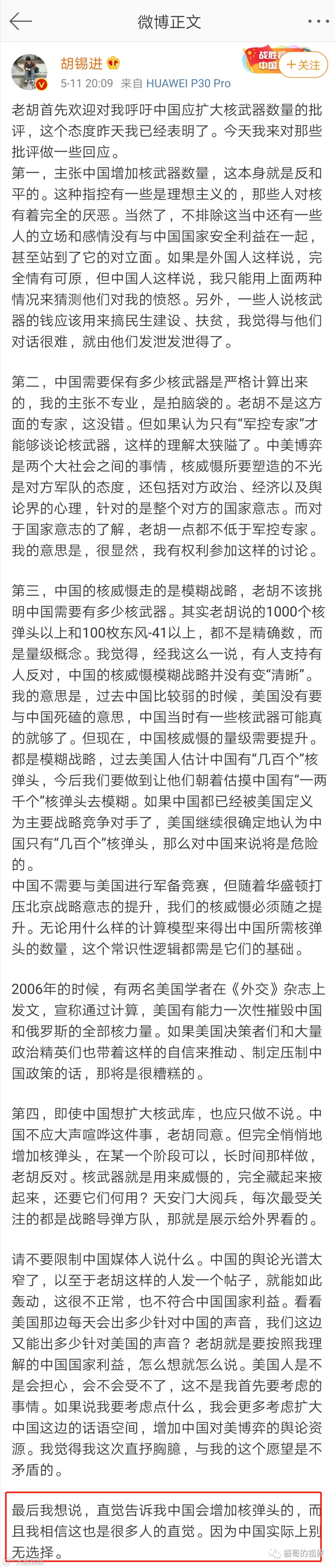 如果说,5月8日—10日胡总的微博还是“含蓄”的提出中国“应该扩大核力量”的理由,在5月11日的微博老胡已经直言不讳的摊牌了