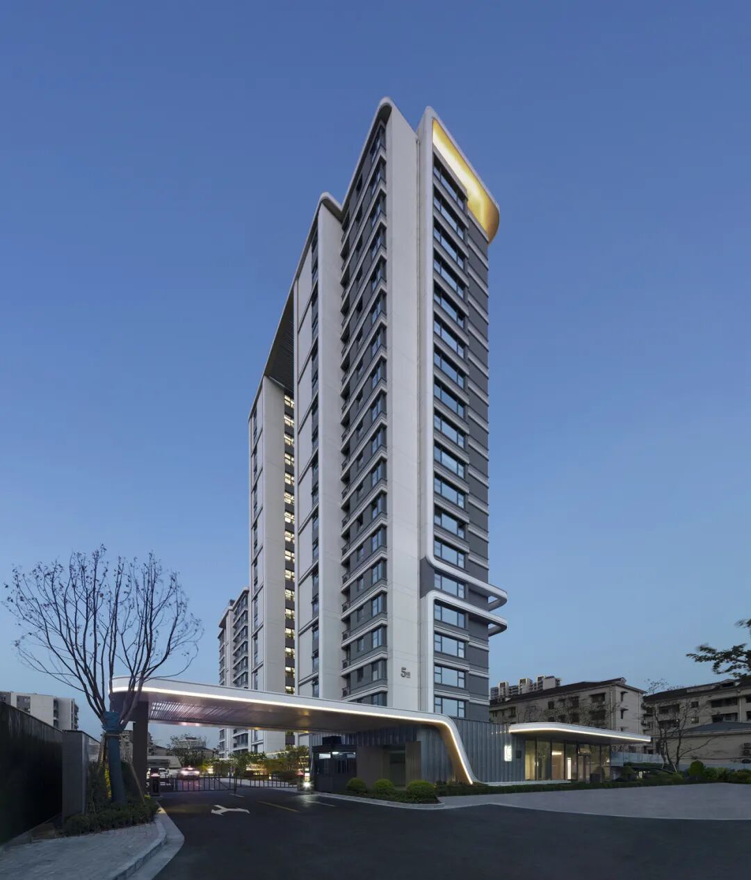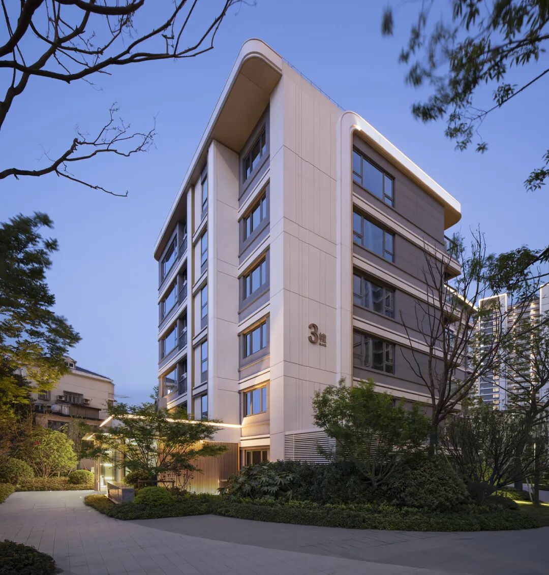 立面的弧线造型打破了传统建筑的直线条束缚,赋予建筑动态的柔美与优雅,轻盈质感的建筑曲线,呈现柔和的视觉效果;点、线、面的灯光组合,进一步强化了建筑的弧线造型与体块穿插。简约的横向线条,浅香槟的经典色调,与自然熠熠相映,展现了东方韵味与现代美学。