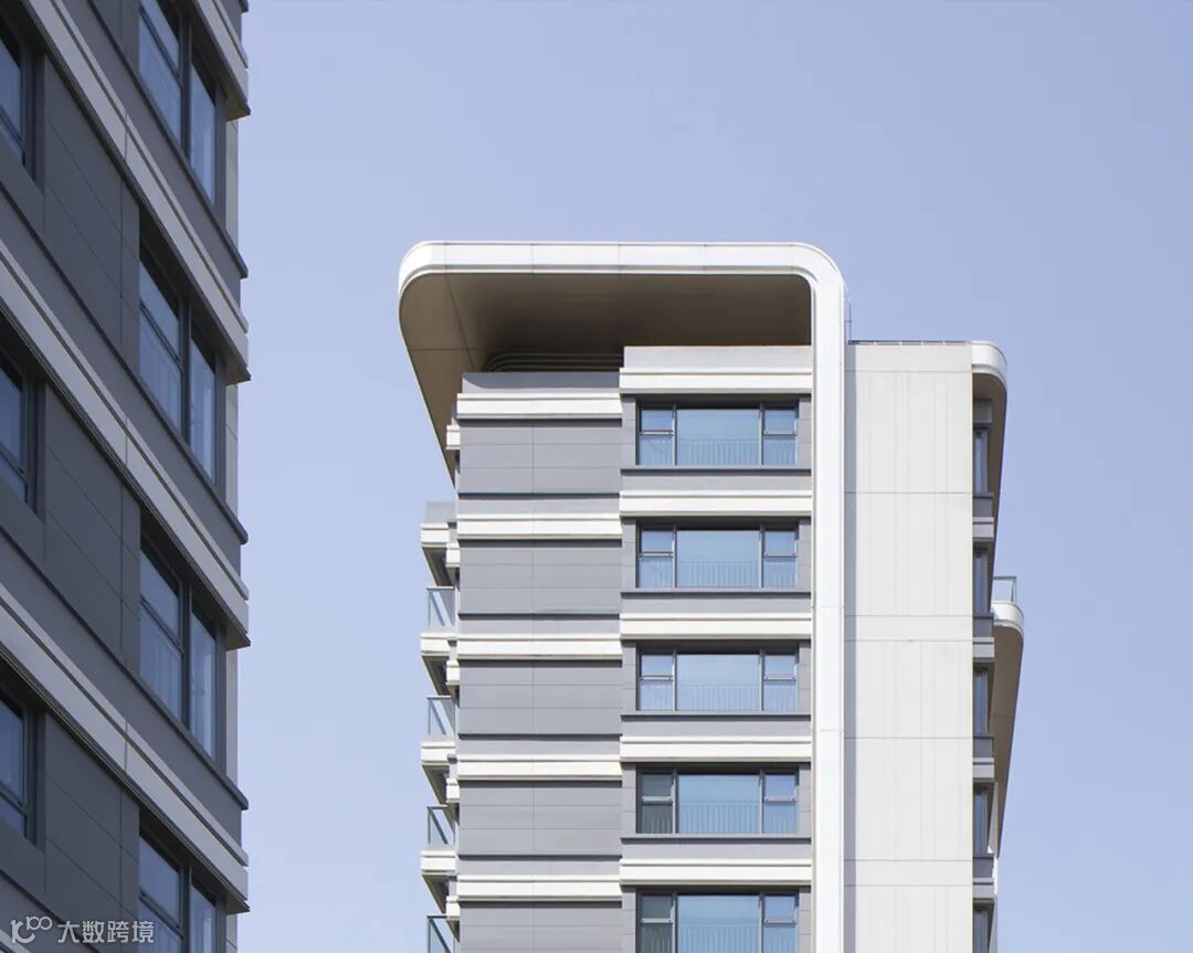 门厅设计采用弧形加落地玻璃,形成通透而富有高级感的入口空间。整体色调以白、灰和香槟金为主,通过材质的对比与搭配,结合入口景墙、景树,营造出极具艺术美学的视觉感受,实现近人尺度的精致呈现。
