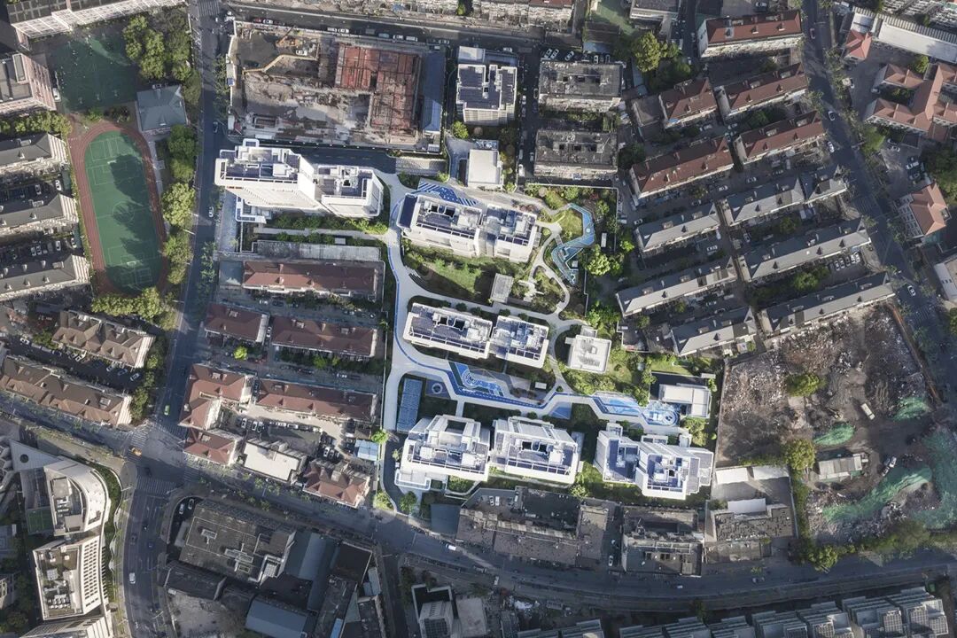 项目位于杨浦区鞍山板块,面对周边新旧建筑杂糅的城市环境,设计以“城市空间的缝合与织补”为介入逻辑,尊重周边环境,沿续原社区城市肌理,以自由律动的建筑形象,消融了社区与城市的边界,实现城市界面的整体焕新。