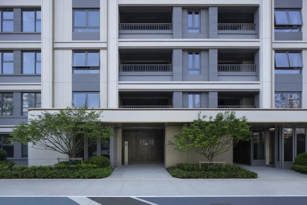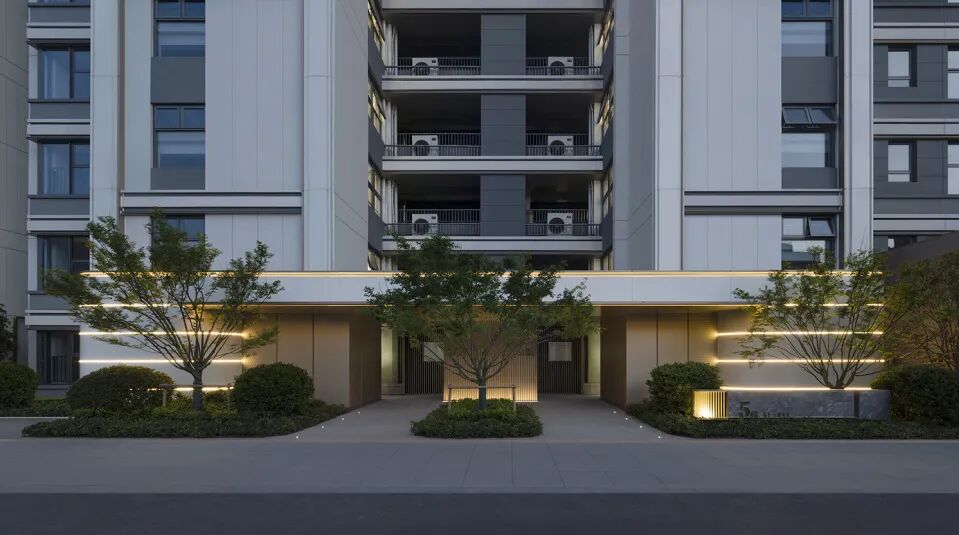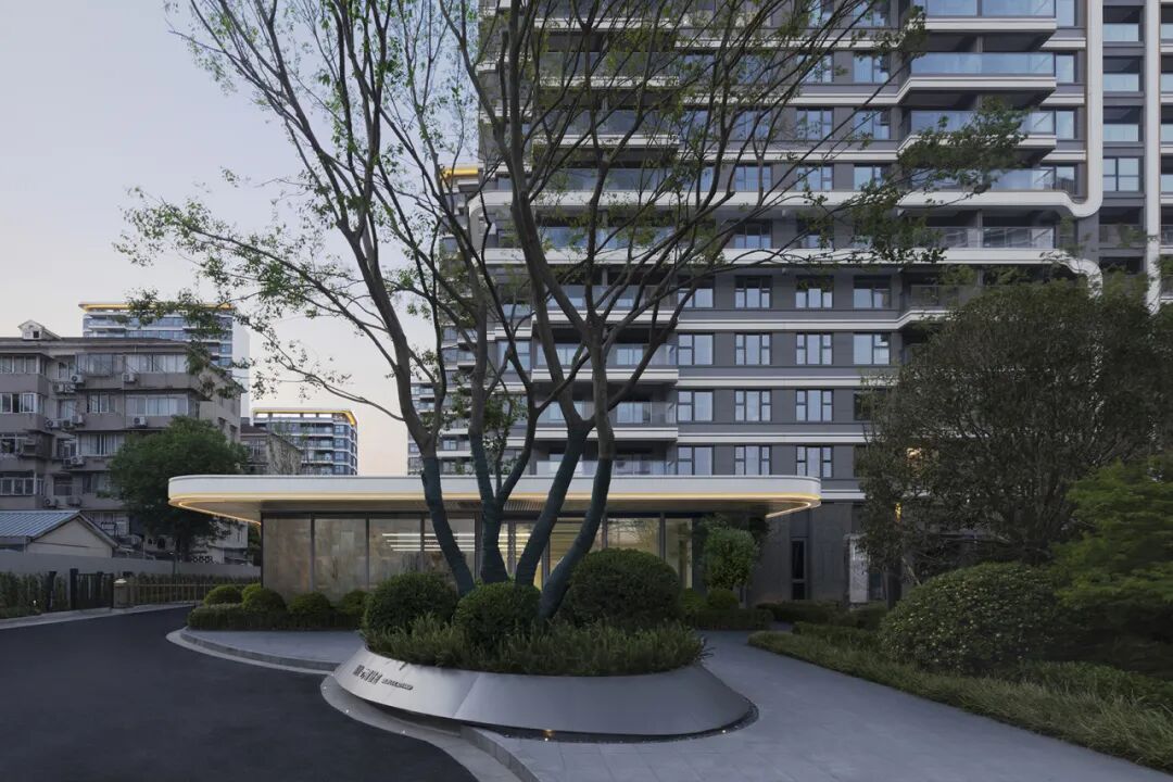 设置在地块南侧与西北侧出入口与城市界面相接,精致的设计细节,酒店式落客广场低调内敛,尽显归家礼序。曲折蜿蜒的进入方式,先抑后扬的空间序列,营造出移步换景的效果,增强了空间的丰富性与趣味性。
