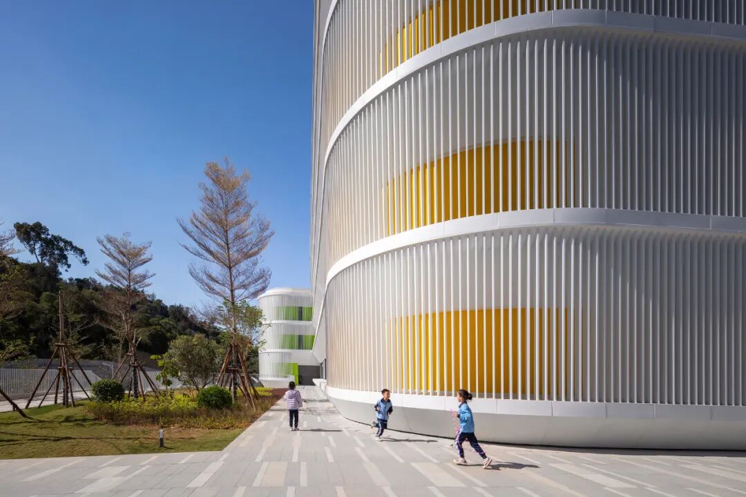 A terrace integrated with nature. The buildings are erected on multiple terraces, interconnected to form a campus that serves as a panoramic platform with excellent accessibility. Located on the western side of the mountain facing the city, the roofs of various elevations create platforms suitable for both distant views and mutual observation. People on Jinbang Road can look at the school from the green mountain next to the train station. The staggered and stacked terraces and roofs shape multiple circulating paths. One can imagine children freely running out of classrooms during breaks, going to platforms at different heights to gaze out, with mountains on one side and the city on the other.