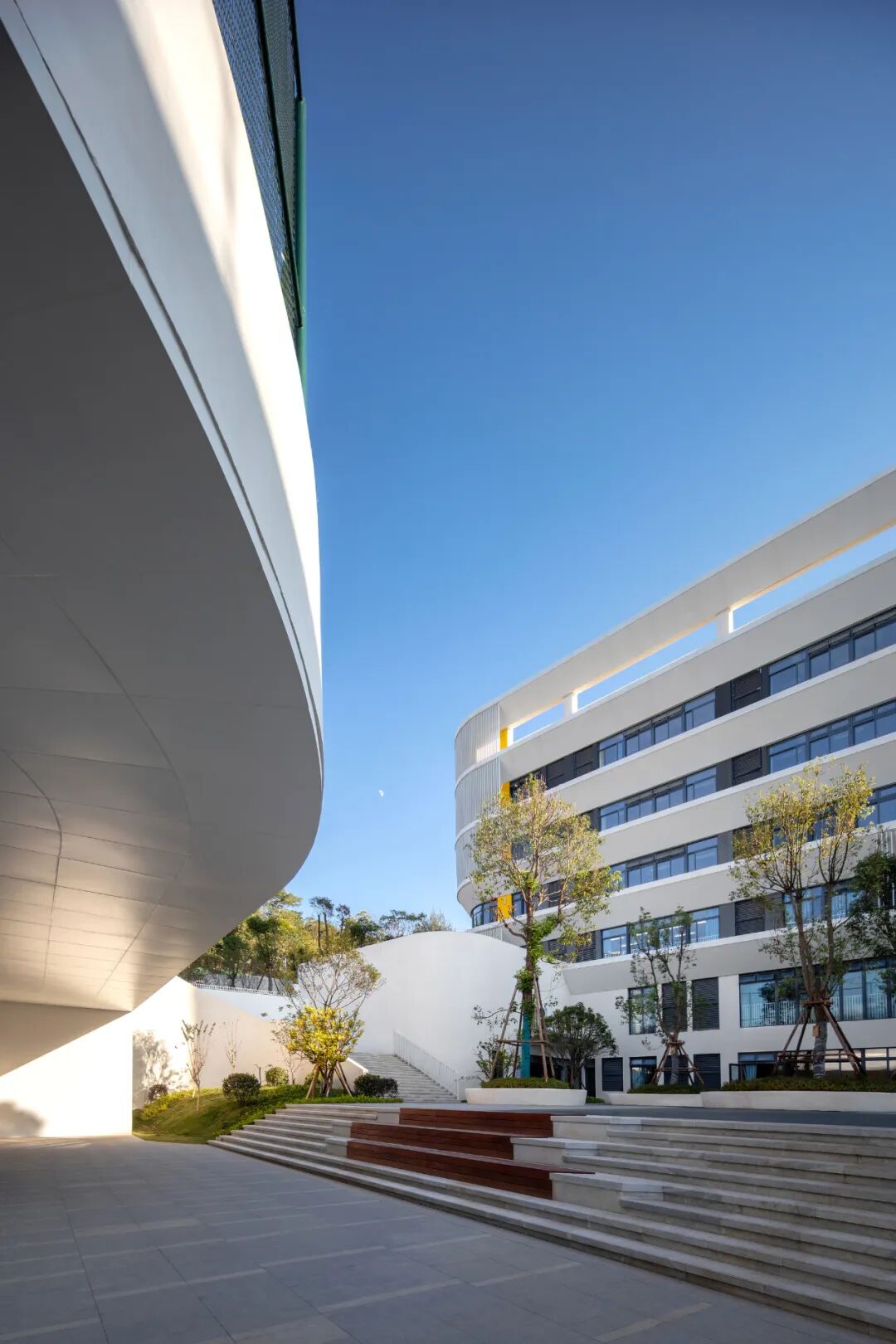 山脉是建筑的背景,围抱校园,建筑群体量适宜,一部分有节奏地抬升、一部分自然放松地舒展开,整体塑造了金榜路东侧新的城市形态,空间开敞,姿态友好,校园景观、校园活动如画卷般连续地呈现给城市,自上而下展示自然与人、与城市积极融洽的图景。
