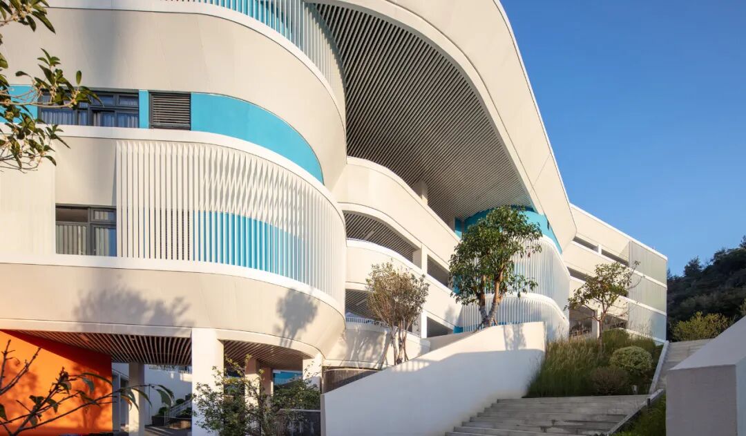 The shape of the mountain. Across from Jinbang Square, lush green barriers and continuous mountainous terrain create a picturesque scene. The design team opted for a relatively intensive morphological strategy, adapting to the natural contours of the mountain and creating staggered connections. They transformed the steep side of the mountain hollow into a rhythmic terraced structure, with sports facilities extending like a spread-out cityscape against the mountain, using long and low volumes to shield and extend the gentle trend of the terrain. The mountain range serves as the backdrop, embracing the campus. The architectural masses are appropriately sized, with some rhythmically elevated and others naturally stretching out, collectively shaping a new urban form on the east side of Jinbang Road. From top to bottom, it showcases a harmonious tableau of nature, people, and the city actively integrating.