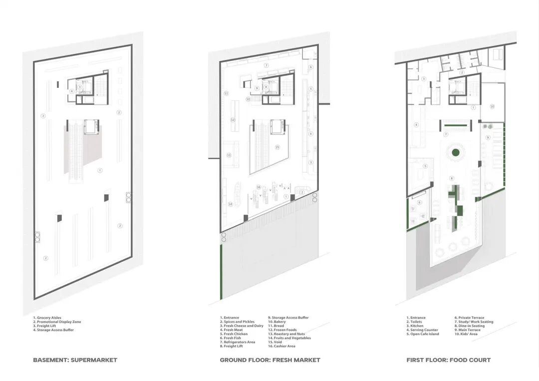 该项目融合了商业和社交空间,有一个三层的超市、美食广场和开放式停车设施。上层为办公和零售空间。精心的规划确保了流畅的流程和不间断的操作,增强了功能和整体体验。清晰、直观的循环无缝引导用户。