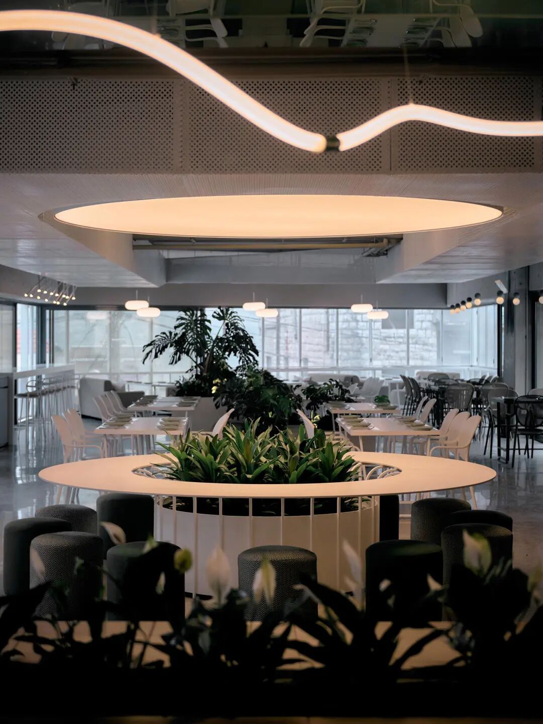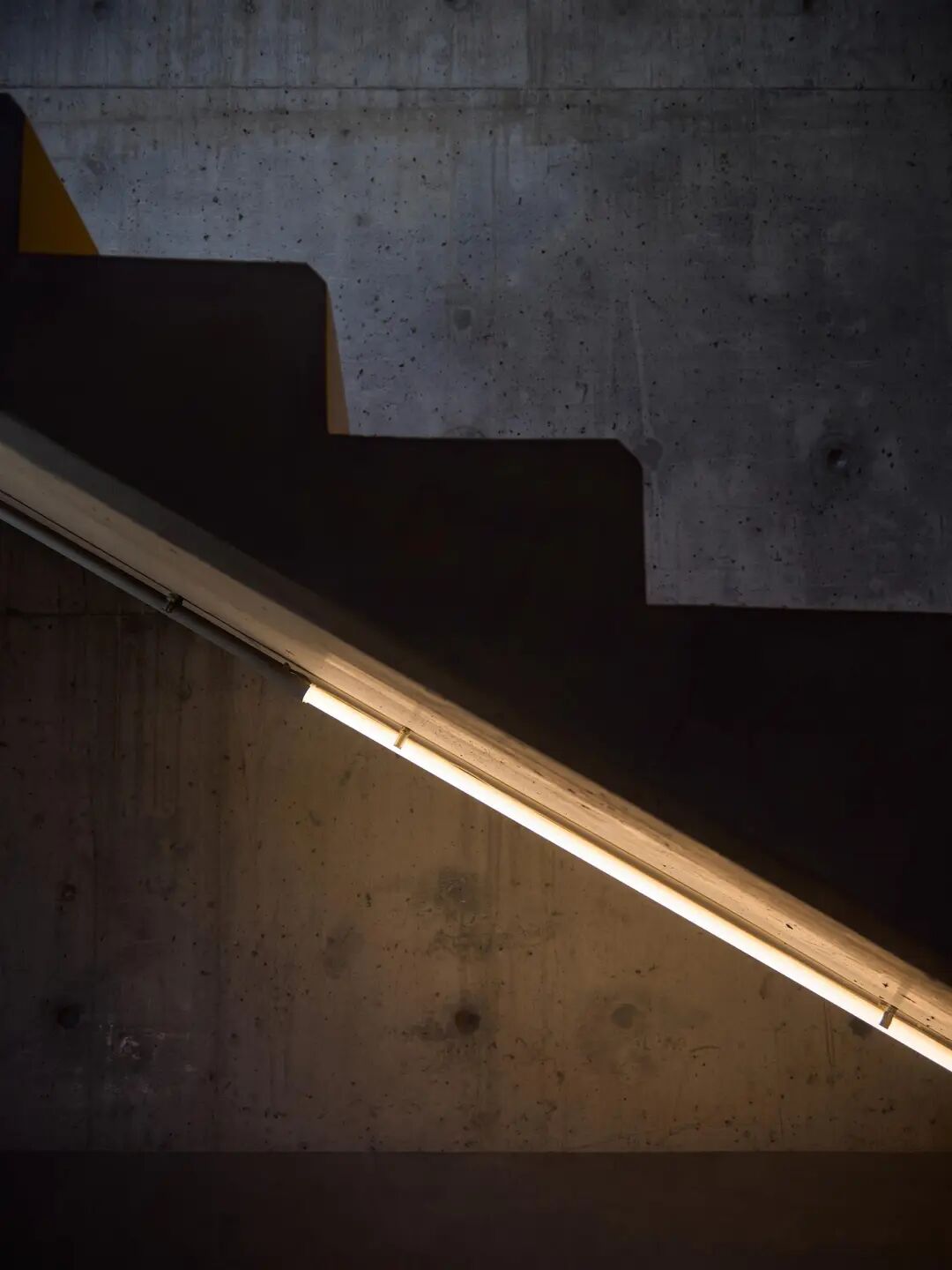 材料的调色板强调对比:暴露的混凝土和机械系统与光滑的白色金属立面并置,表达了坚固实用与雕刻优雅之间的对话。这种张力定义了建筑的双重身份,既接地气又令人向往。