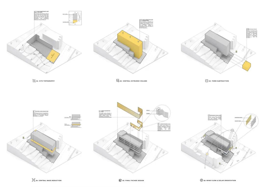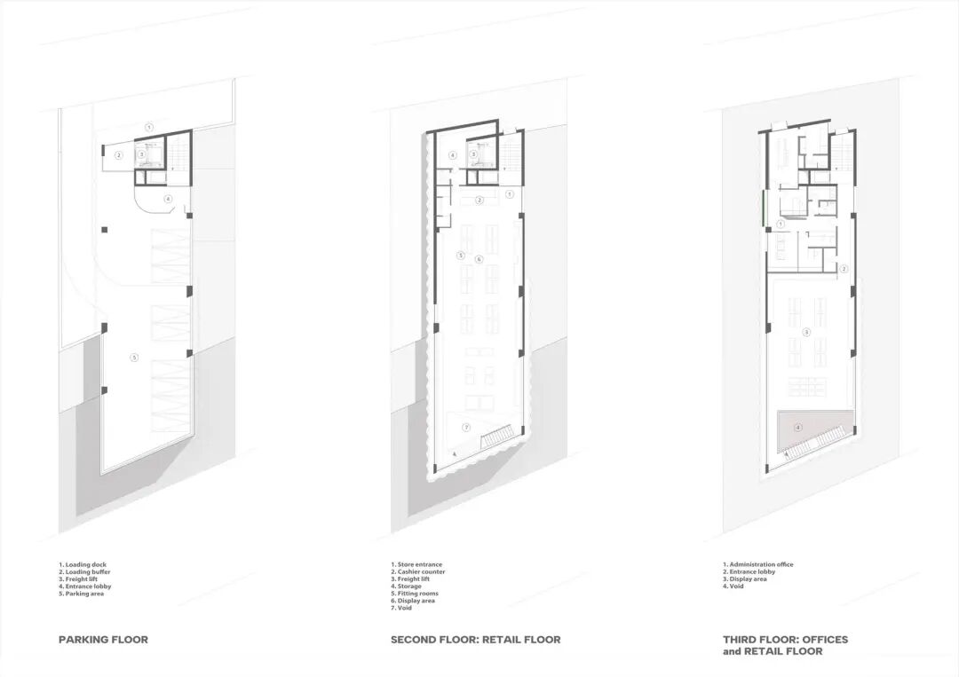 项目的演变受到设计和施工挑战的影响,这些挑战塑造了结果。紧凑的地块和狭窄的临街促进了空间的垂直分布,并引入了悬臂体块来扩大街道的存在感。从结构上讲,在宽阔的大厅中最小化柱子需要大跨度和悬臂式地板,这需要先进的工程技术,使用专门的张力电缆和高精度混凝土技术,这推动了当地建筑实践的极限。