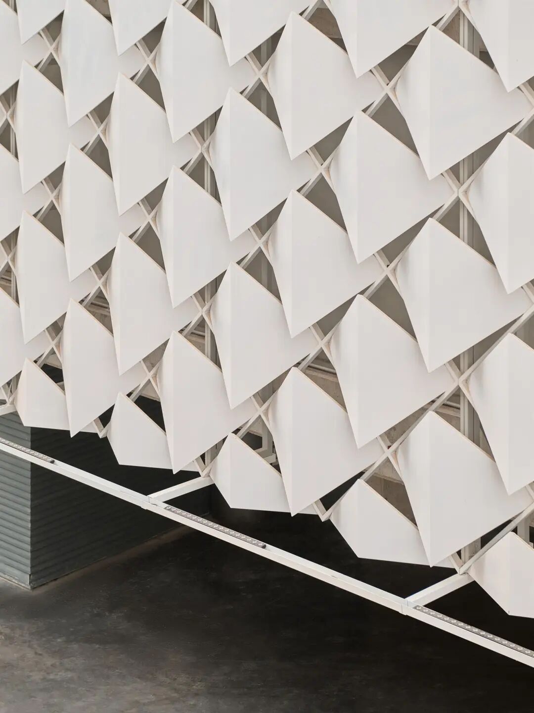 The building's facade balances industrial rawness with refined sophistication. A geometric white aluminum skin, shaped by algorithmic logic, wraps the structure in layered patterns that alternate between solid and transparent. This dynamic facade conceals irregular functions while offering glimpses into the building's interior life, balancing privacy, shading, and ventilation.