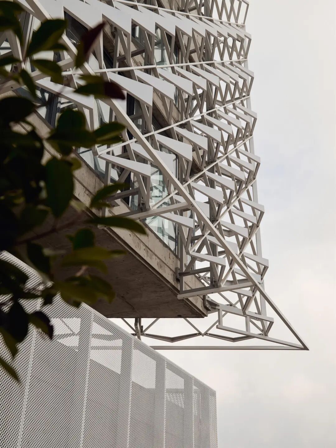 建筑的立面平衡了工业的原始与精致的精致。几何白色铝表皮由算法逻辑塑造,将结构包裹在固体和透明之间交替的分层图案中。这个动态的立面隐藏了不规则的功能,同时提供了对建筑内部生活的一瞥,平衡了隐私,遮阳和通风。