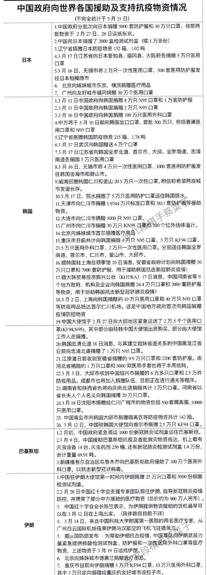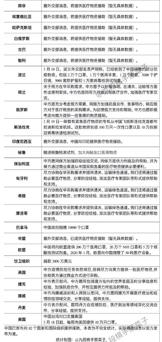 微博用户九段棋手蔡菜子曾经做过一个统计,截止到3月21日,中国向世界各国援助的物资如下: