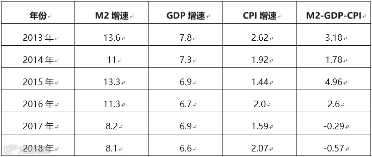 我按照这个数学模型做了一点功课,把2013年—2018年M2、GDP、CPI这三个指标的增长率数据,以及M2-GDP-CPI的数据做了一个表如下(为啥选2013年这个时间节点?原因你们自己去想)。