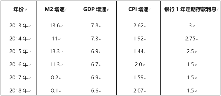 从这个表格我们可以明显看出,从2013年—2016年我们的货币其实一直保持较为宽松的状态,2017—2018年“去杠杆”货币收紧,所以这两年大家都感觉日子不大好过。