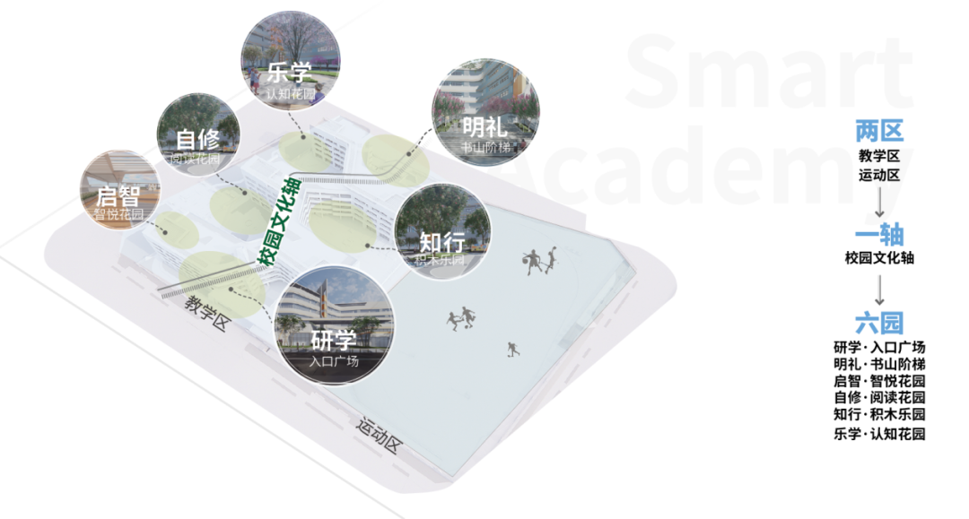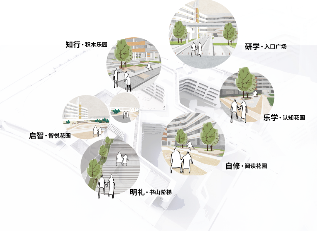 校园文化轴依次连接入口广场、书山阶梯、智悦花园、阅读花园、积木乐园、认知花园六大庭院空间,为校园文化拓展更为丰富的内涵,同时成为学生日常交流、学术研讨的重要场所。在规划中,我们打破传统传统校园单一的教学空间,因地制宜,将文化、创新、自然融入校园,把学习与交流空间延伸至户外,打造更为多元化的现代理想校园,营造更具识别性与记忆点的场所空间。文化轴线的引入不仅有助于打造一个舒适、便捷、富有自然意蕴的校园环境,也为学生的全面发展提供有力支持。
