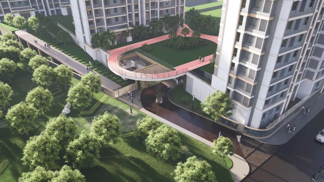 车行入口融入架空平台边界,形成一体化门头,这样开车归家也能享受到和步行归家一样的仪式感。