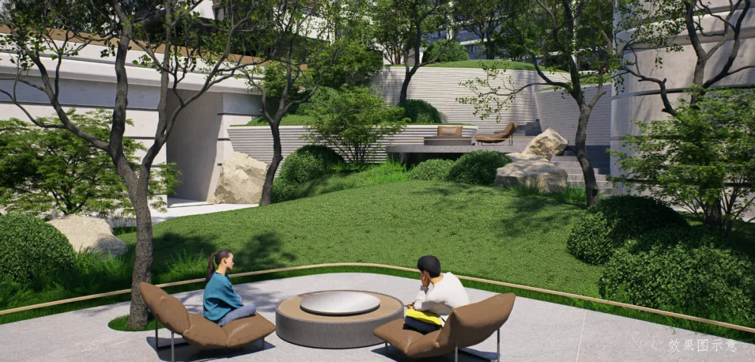 结合规划布局和架空平台进行打造,全架空体系,场地抬升5.5m,平台板按规范比例开洞,效法传统开山理水的造园手法,将仪式礼序融入园林景观,集中设置在地块中央,结合景观设计,形成一条中央绿谷,高架空平台与多层级下沉庭院形成立体街巷,全域绿化,进人尺度体验丰富。