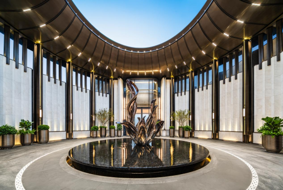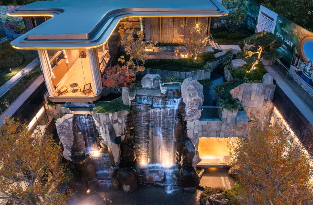 项目利用总抬高约5.7米、净高约4.1米架空层,将“立体感”“垂直感”赋予景观设计中。鎏亭、叠瀑、流瀑水院……自然融合,让人美不胜收。