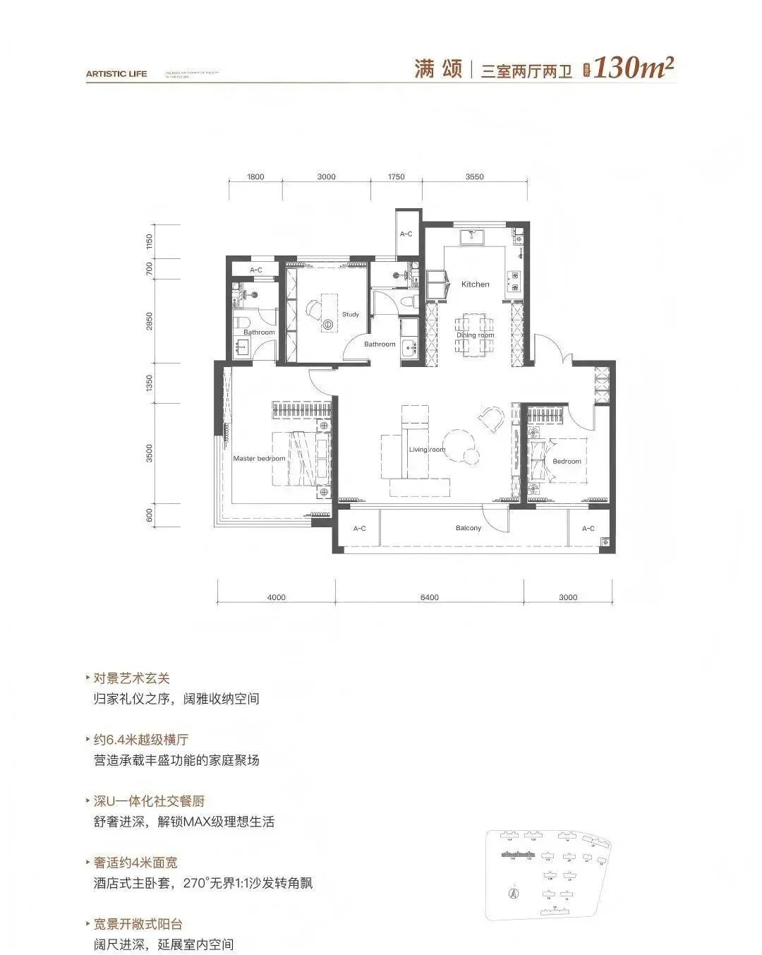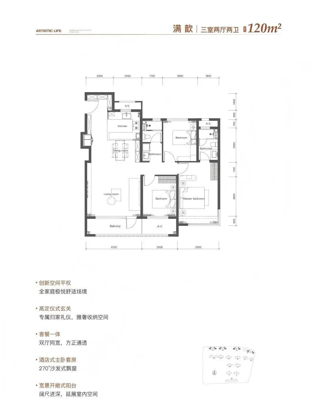 创新洋房理念:打造建筑面积约117-135㎡墅镜洋房:在户型上融入三重立体玄关、超大宽幕巨厅;转角飘窗、酒店行政级主卧套等创新理念;为峯层人士打造高阶府院洋房。