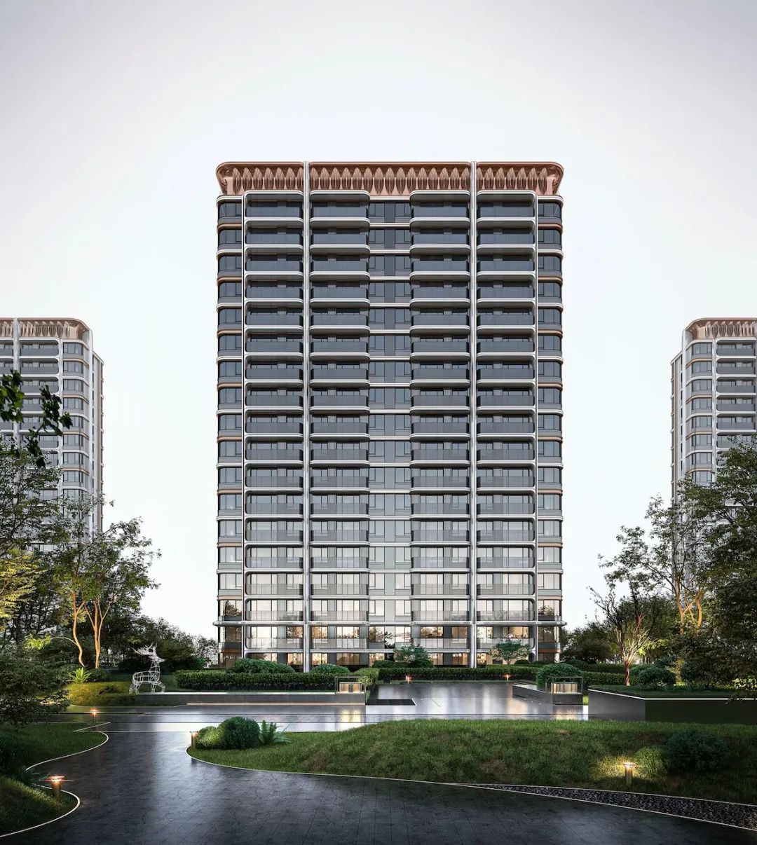 产品风格整体采取了更具有现代感的表现形式,注重表现虚实对比关系,材质的肌理关系,以公建化模式、色彩交织的线条强调立面形象与标志感,由银灰色、香槟金颜色构成,呈现时尚美学的风情与活力氛围。