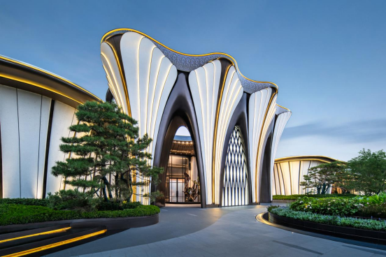 入口以层叠双曲面打造金色叶片,截面变幻如生命勃发,镜面不锈钢与光影共舞,将自然万象凝练为当代奢雅符号。