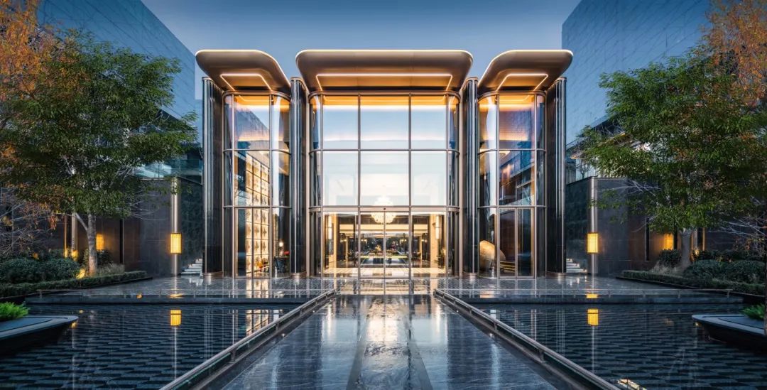 构成语言选取玉兰为母题,通过元素的提取、重构,将凝练的建筑语言融入主入口形象设计中,从柱式、雕塑、屏风纹样三个维度加以表达;结合铝板型材、金属线条、通透玻璃等现代材料,体现精致的细节,彰显尊贵气质。