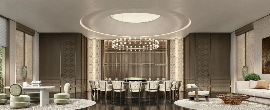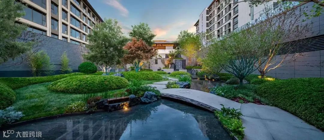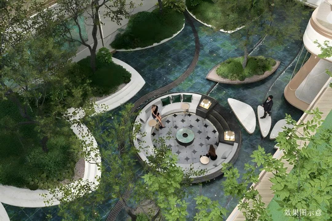 架空平台下,结合下沉庭院、打造奢隐的私家社区生活组团,融合山川河岳的东方园林与私家会所空间,形成生态自然的社区活动空间。