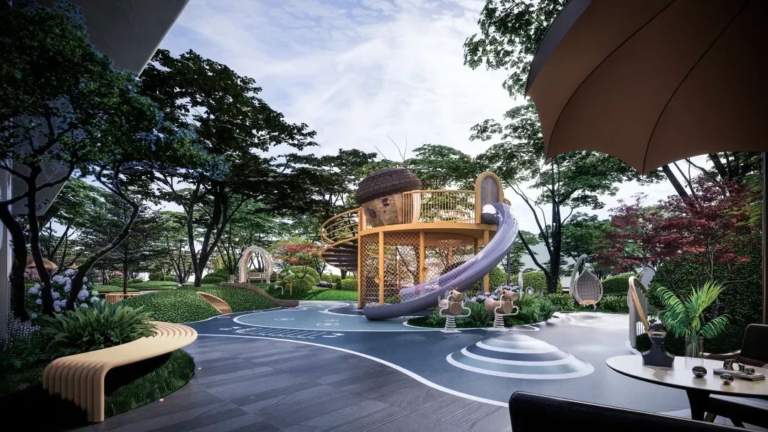 五大主题场景:都荟公园-尊享入口-艺术之岛-森岛派对-大眼金的松果乐园,约6500㎡度假级景观公园,实现先入园再归家的生活体验。