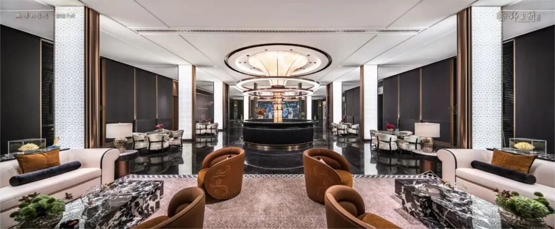 一进迎门启序,宽约32米、高约7.5米的礼序门庭,以海棠纹印鎏金铺陈,打造滤境式人文画境;