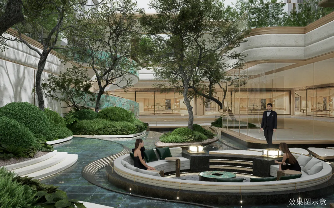 项目打破传统平面布局匠心构筑最高约8米台地立体园林。精心打造约600m下沉层叠水庭,引用斯卡帕艺术技法,整石铺就亚马逊绿奢石。