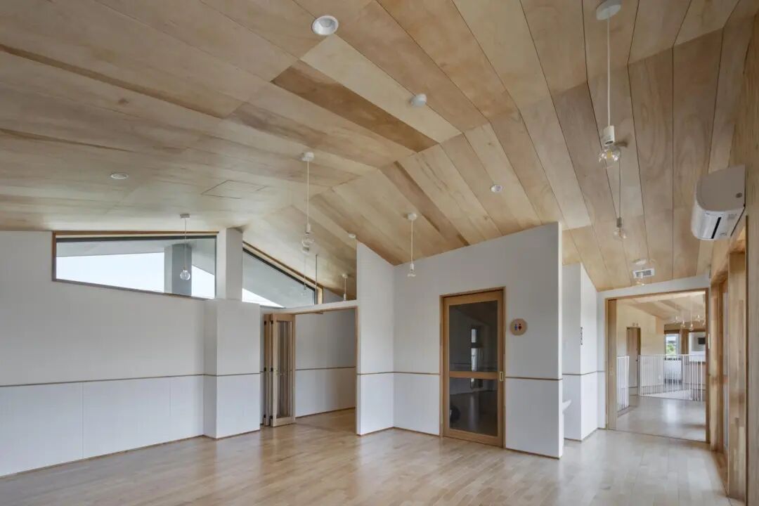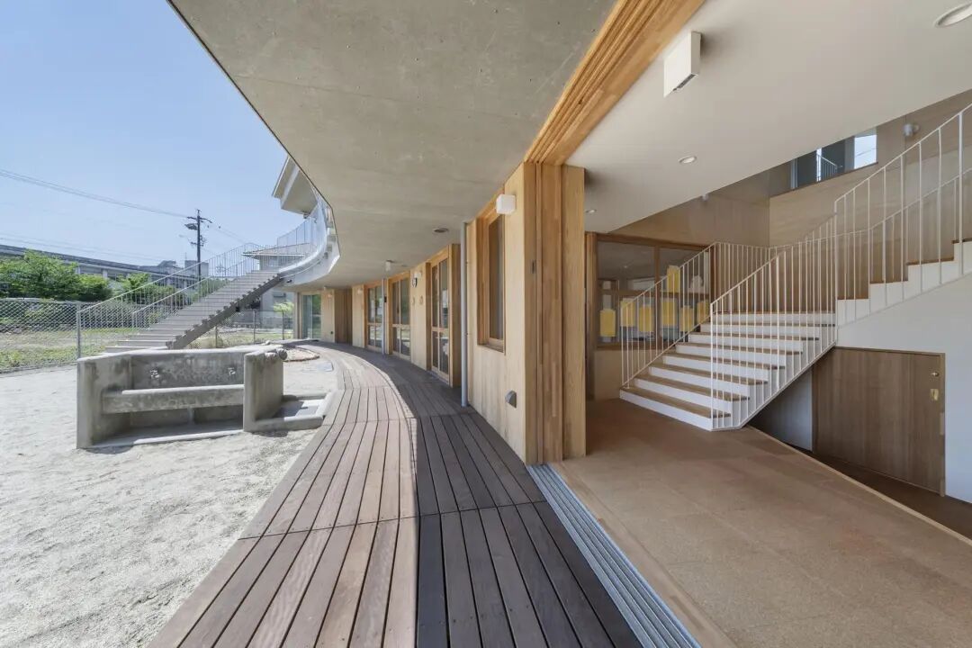 The building's curved forms and triangular roofs harmonize with the surrounding residential fabric while creating a rich, playful spatial experience. External curves buffer the facility from neighboring homes; the internal veranda's curved edge seamlessly connects each classroom to the garden. Architectural elements such as outdoor stairs, slides, and a net-filled atrium serve both as emergency egress routes and imaginative playgrounds.