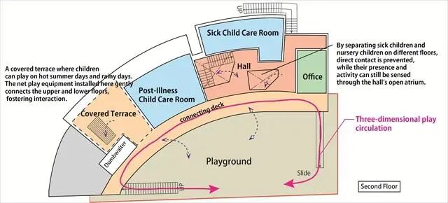 Kids Land Miyabino是一家由医疗公司运营的公司主导的托儿设施。除了每天的幼儿教育外,它还与附近的诊所合作提供特殊服务,如照顾生病的儿童。该设计将身体活动、同理心和创造力放在首位,鼓励孩子们自由玩耍,自然地与他人互动。