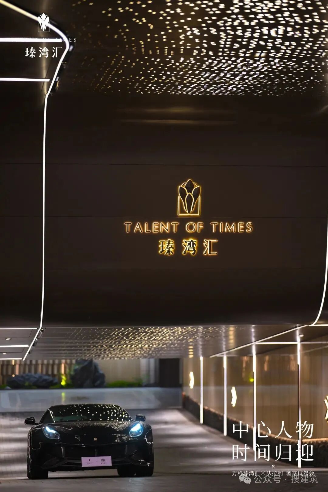 东莞瑧湾汇的车库入口坡道,顶部弧形曲线圆润优雅,借鉴劳斯莱斯设计理念的巨幕级星空顶,犹如一条璀璨的银河。搭配镶嵌于高阶色系铝板的项目星光LOGO,将艺术与奢侈完美融合。