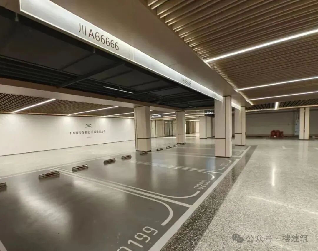 成都招商·翎雲阁车库设计水磨石地面,车道吊顶,豪装光厅。