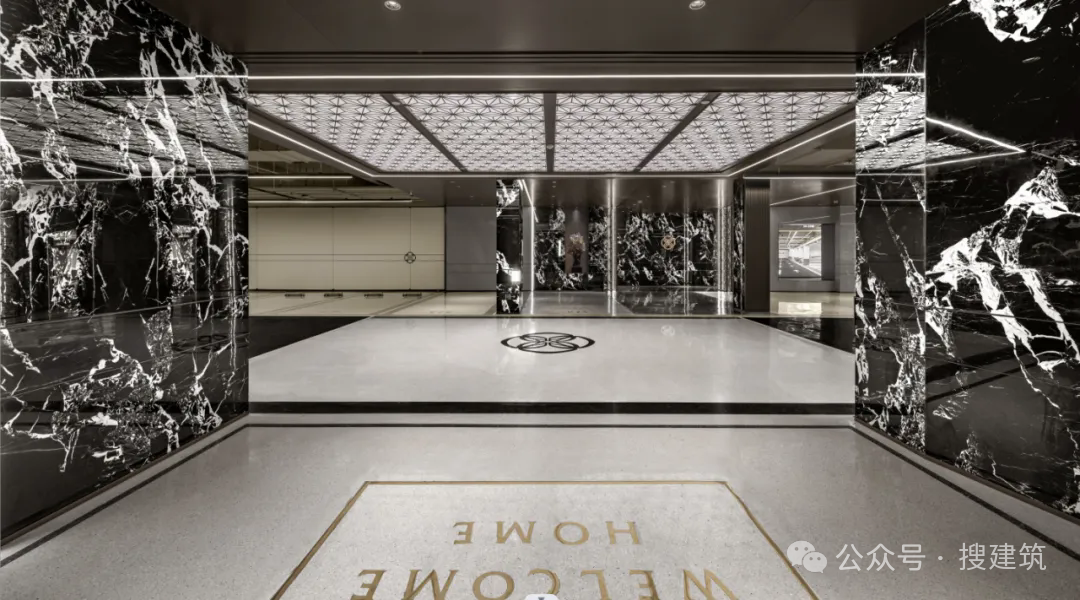 中环置地中心·润府地面的拼花设计非常的海派。还有铜制的金属嵌条勾边,精致尽显。侧面主景墙也选择了全石材,并配上了宝格丽黑的石材做点缀,精致奢华而不油爆。