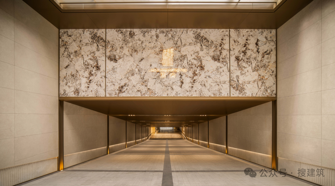 车道地面采用芝麻白、芝麻灰全石材通铺,通过墙面石材错位交叠和引导性的线性灯光,令回家之路充满了仪式感。