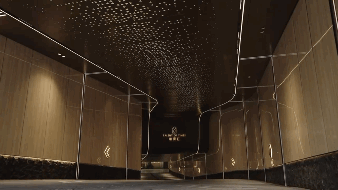 台州杨帆梧桐府,地库坡道末端设置流光溢彩的精奢车库玄关。长约45米蜂窝铝板通铺,结合星空闪烁的视觉效果。