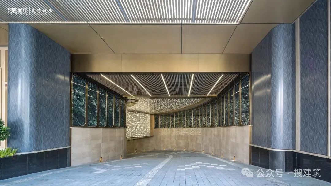 再比如,温州招商保利·天樾玺在地库坡道天花板设计中,以造价高昂的手工定制镶嵌闪烁星光灯珠形成星空穹顶,辅以密拼工艺连接的铝板,缝隙小而规整。