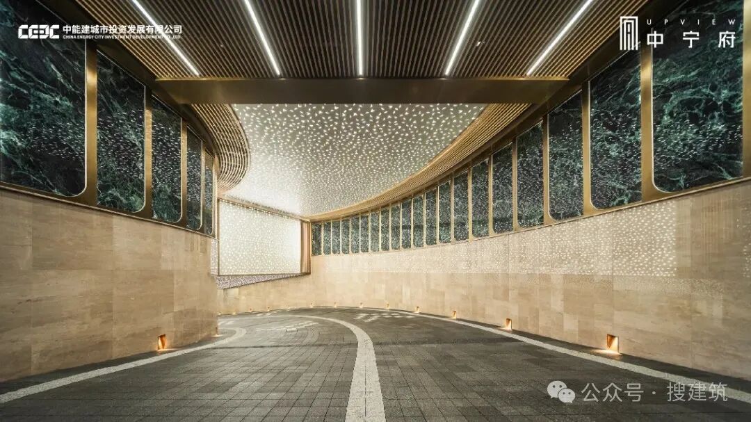 南京能建城发·中宁府地库入口,与小区大门同高,留出了足够的顶部空间。坡道入口采用亮眼的prada绿奢石,配上星光顶和格栅,线性灯光点缀,很是吸睛。