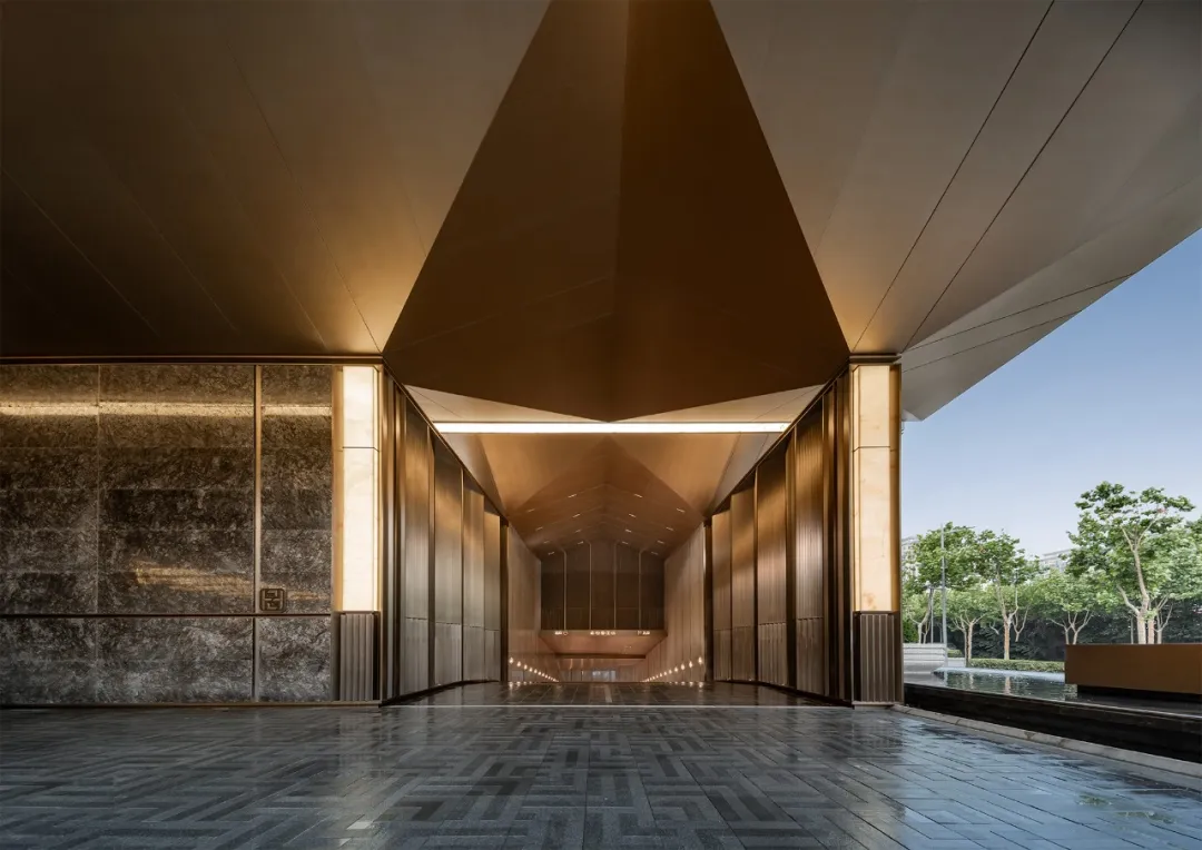 南京绿城华发金陵月华地库设计约7米净宽地下坡道入口,与小区大门同高,留出了足够的顶部空间,顶部中式折叠金属板华盖设计,呈现华贵归家礼仪。