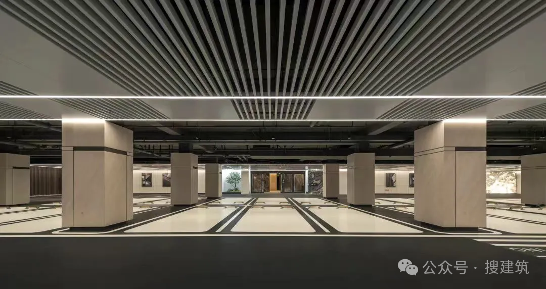 比如,南京金基瞻月府地库整体色调高级且柔和,主车道和楼宇间的顶面都采用银白色格栅处理,立柱大砖铺装,整个空间干净整洁、精致高级。