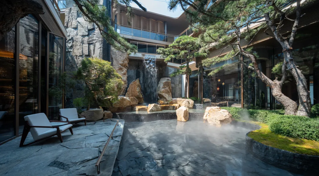 景观以「四境四巷」铺陈东方礼序,「五重归家」轴线串联宽约128米恢弘门庭、约15米叠石飞瀑、约13米榫卯转译的现代穹顶等。